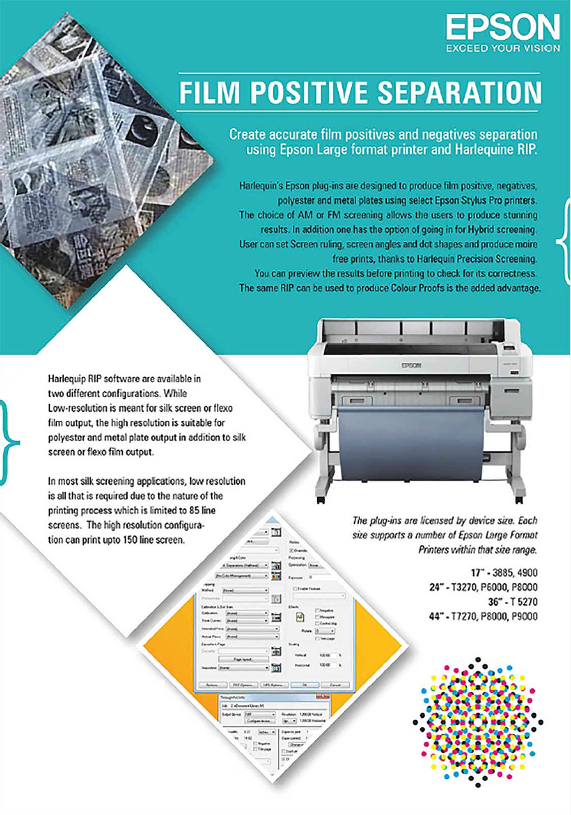 When we install Epson printer with Film Maker software, you get the positive or negative that almost produce Image-setter quality. With such film, not only you can do film separation for Screen Printing but it is also very useful for producing FLEXO plates.